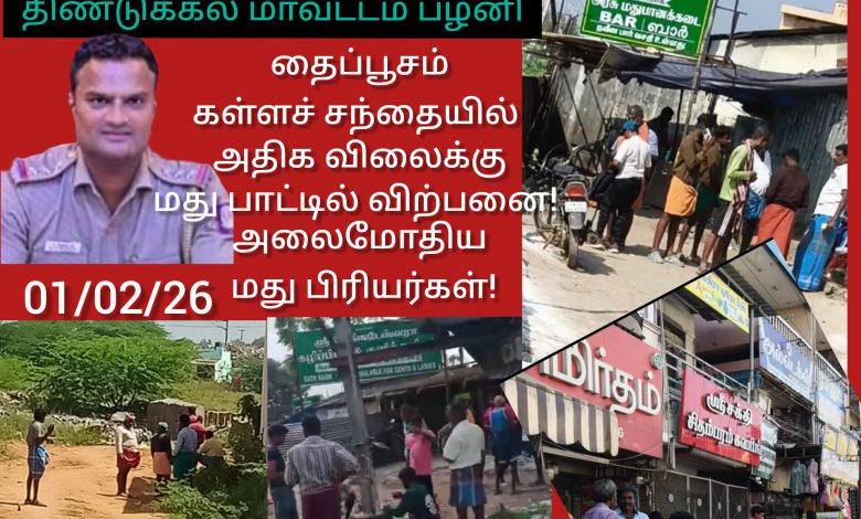 தைப்பூசம் வள்ளலார் இராமலிங்கனார் நினைவு தினமான 01/02/26 திண்டுக்கல் மாவட்டம் முழுவதும் டாஸ்மார்க் கடை மற்றும் மதுபானக்கூடங்கள் மற்றும் FL-2 தனியார் கிளப் அனைத்தும் விடுமுறை என மாவட்ட திண்டுக்கல் மாவட்ட ஆட்சியாளர் அறிவித்துள்ளார். ஆனால் அந்த அறிவிப்பை காற்றில் பறக்க விட்டு